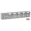 Alto: 114 mm | Ancho: 600 mm | Fondo: 92 mm. Contenedor de la marca VIPA con 6 cajones basculantes de plástico transparente.
