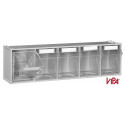Alto: 165 mm | Ancho: 600 mm | Fondo: 133 mm. Contenedor de la marca VIPA con 5 cajones basculantes de plástico transparente.